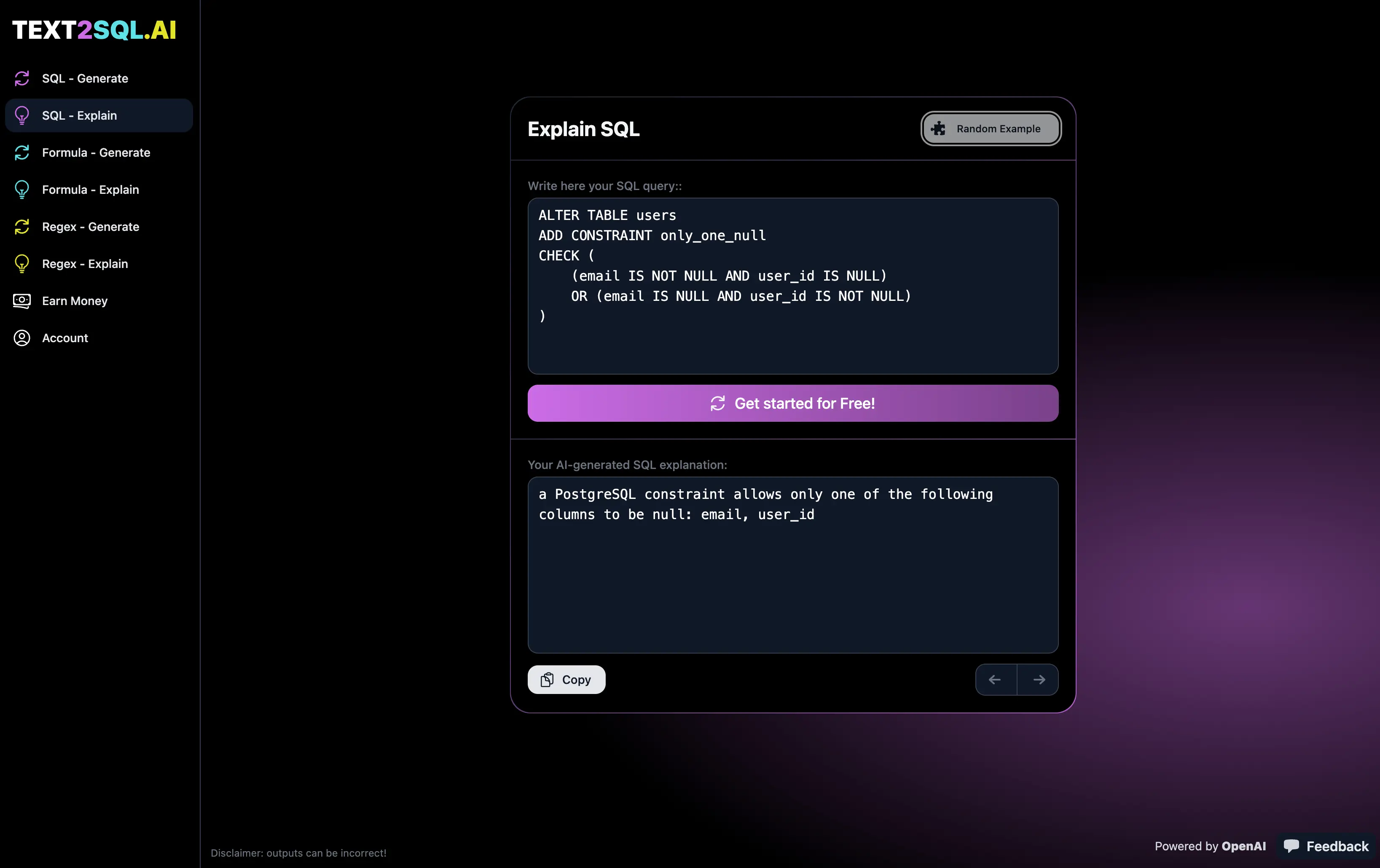 When compared with other SQL AI tools, their website that besides being affordable (current price is $4/month for 300 requests), it is also the only tool capable of generating SQL as well as regular expressions, Excel and Google Sheets formulas (again, perfect for business analysts who need to work with Excel and data all the time!).